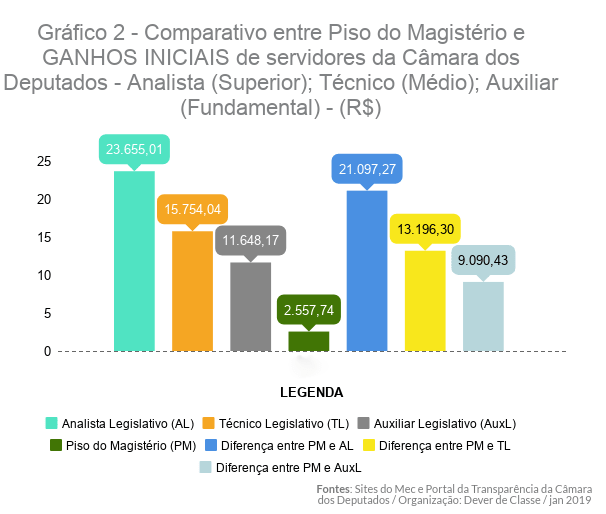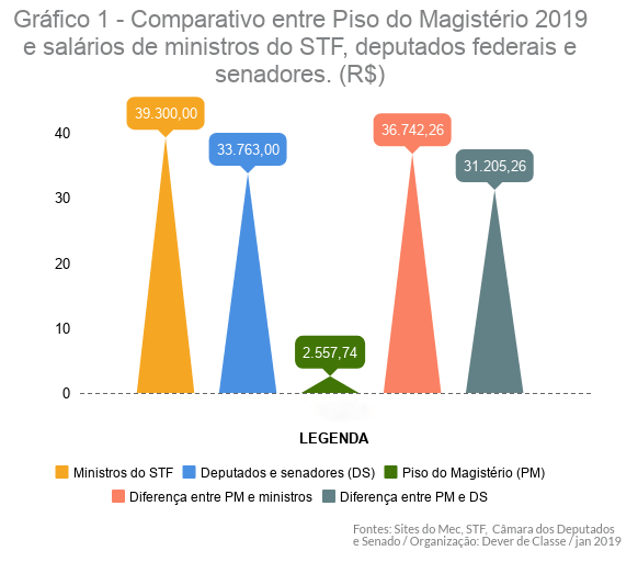 - O Gráfico 1 compara o Piso do Magistério para 2019 com os salários de deputados federais, senadores e ministros do STF. Os números servem para denunciar as autoridades brasileiras, que só pensam em manter altíssimas regalias, enquanto os educadores vivem no arrocho.