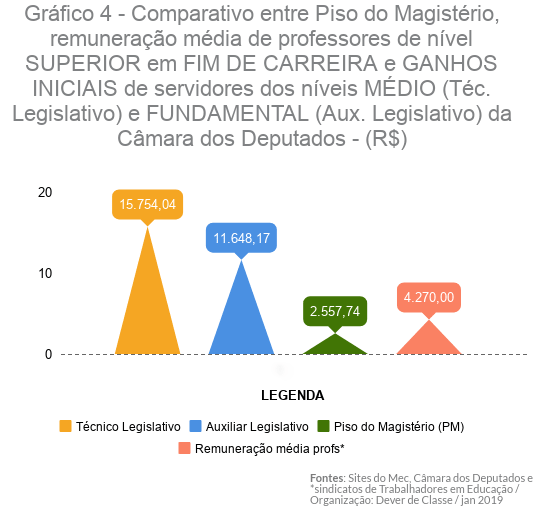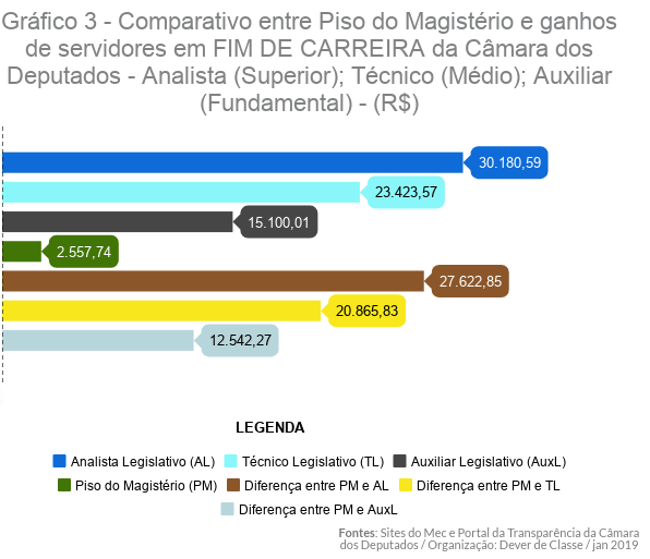 Já o Gráfico 3 faz comparações entre o piso dos professores para 2019 e o de servidores da Câmara dos Deputados em final de carreira. Um massacre. Quase nem dá para ver no gráfico quanto recebem os mestres.